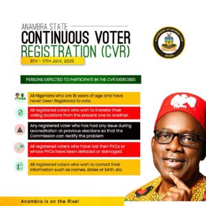 Which is why the Independent National Electoral Commission (INEC) has opened a critical window for the Continuous Voter Registration (CVR) in Anambra State, running from July 8 to July 17, 2025, in preparation for the November 8, 2025 Governorship Election. This comes as a golden opportunity for all eligible citizens and residents of Anambra State to take action, register, and ensure their voices are heard in shaping the future of our beloved state.
